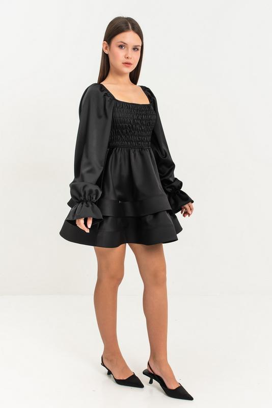 Чорна атласна сукня для дівчинки з довгими пишними рукавами
