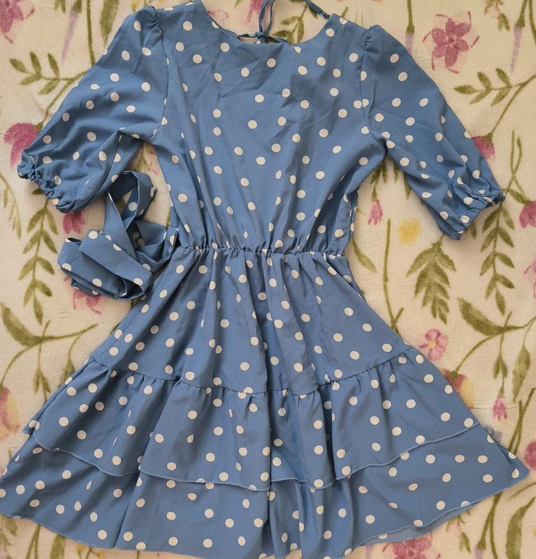 Платье в горох, длина -69,плечи-27,грудь 38см, пояс 24-40см,рукав 26, ширина 15.Нюансов нет, как новая, одевали разы три.