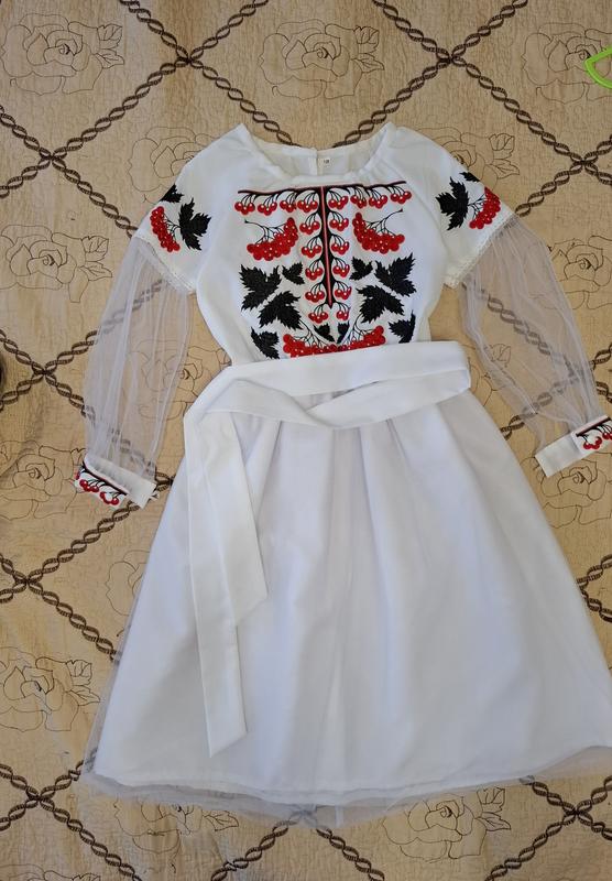 платье-вышиванка Калина, рост 128,6-7 лет,нова,цвет белый,купали с сайта, но не одета, в свою очередь замала.Рукава фатин,юбочка сверху 2 слоя фатина,пояс резинка, имеет широкий пасок,ткань платья плотная, просвечивает. длина по спинке 88 рукав от горловины 52 пог 39