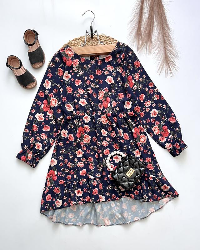 Сукня квітковий принт 10р (140)💕 Стан - нової , колір синій Довжина спинка - 72, спереді - 64, груди - 37, пояс - 28, рукав - 45