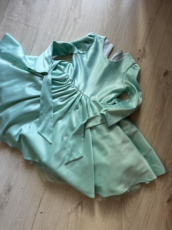 Сукня 116-122 купувала для доньки за 2400 продаю за 800, дуже гарний підюбгик в колір сукні за рахунок чого спідниця дуже пишна але легка, між підюбником і ніжками є ще окрема атласна спідничка, щоб дитині було зручно навіть без колготок її
