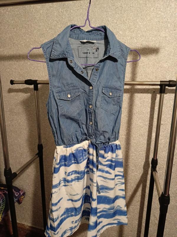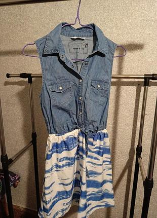Платье на 146см верх джинс низ полиэфирное полотно, хлопковое.объем груди 80см талия на резинке