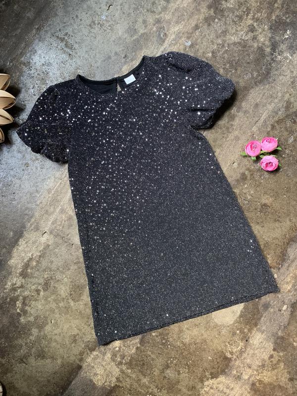 Сукня дитяча від Next в чорному кольорі декороване люрексом та паєтками в сріблі.Рукава ліхтарик.С першого погляду простий фасон,але має свою родзинку.Така собі маленька чорна сукня для маленьких леді.Приємна до тіла.Ззаду застібка гудзик. Склад тканини 93% поліестер 4% люрекс 3% еластан Тканина тягнеться В ідеальному стані На етикетці вказано на 8 років Параметри Плечі 34 см Пог 40 см Пот 42 см Рукав 18 см Довжина 68 см Виробник Турція