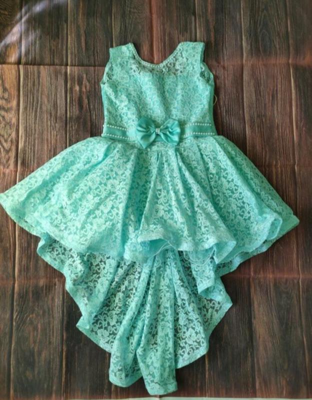 Красивое бирюзовое платье на рост 116-122(6-7 лет) с небольшим шлейфом. Спинка на молнии, дополнительно затягивается шнуровкой. Кружево м мягкое, приятное к телу, юбочка об емкая, благодаря пышному под юбнику. Платье в идеальном состоянии, одевалось один раз на выпускной в садик. Без дефектов. Замеры: Длина спереди 69 см, длина со шлейфом 105 см, длина до талии 35 см. ПОГ(под руками полуобхват) 36 см Талия полуобхват 34 см Плечи 28