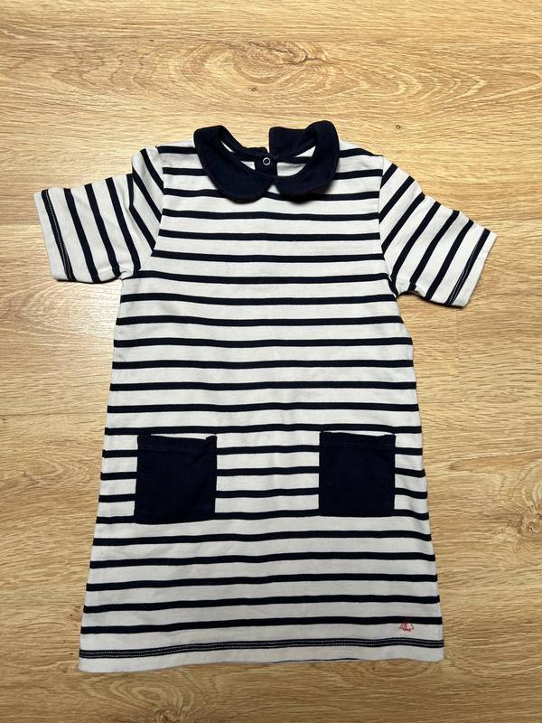 Модное и удобное платье в морском стиле для девочки. ✔ Материал: мягкий трикотаж, приятный к телу. ✔ Классический чернобелый полосатый принт. ✔ Короткий рукав - отличный вариант на весну/лето. ✔ Оригинальный воротничок с кнопкой сзади. ✔ Два накладных кармашка спереди. ✔ Стильная и универсальная модель на каждый день.