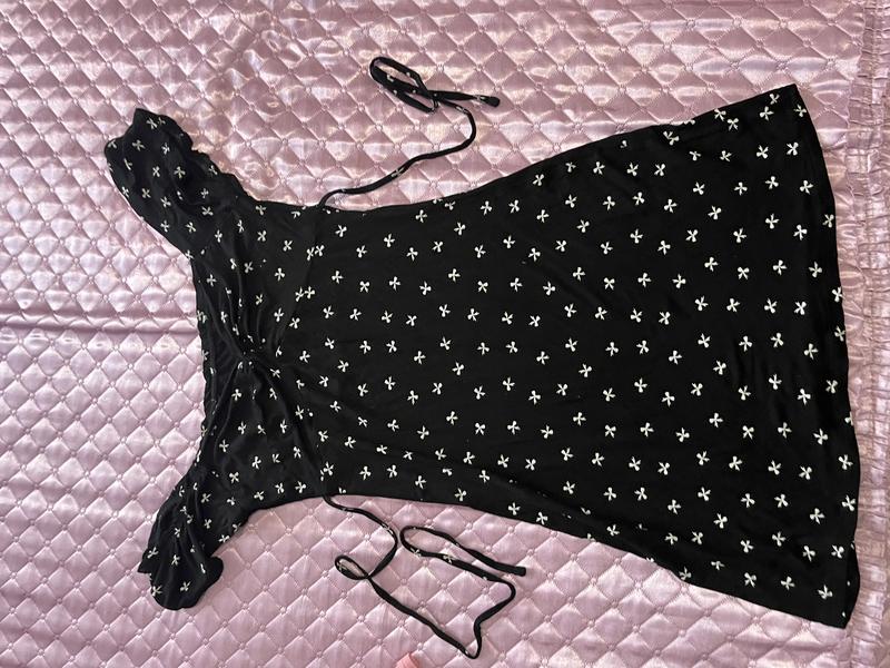 сукня вище колін, розтягнута, мій розмір s/m бедра M/L підійде на L стан задовільний, резинка на рукавах і на арені розтягнута, є завʼязки на талії якщо потрібні заміри пишіть можливий торг