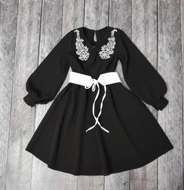 Платье с вышивкой (не рисунок!) Пясок в комплекті. По спинке застегивается на пуговицу. Манжети на гудзиках. Пояс под резиночку. Ткань -костюмная, хорошее качество. Замеры: 140 длина - 80см, полуобхват груди - 38см, рукав от плеча - 49см. 146 длина - 83см, полуобхват груди - 40см, рукав от плеча - 51см. 152 длина - 83см, полуобхват груди - 42см, рукав от плеча - 53см. 158 длина - 88см, полуобхват груди - 43см, рукав от плеча - 57см. Размеры в наличии: 140-2шт 146-1шт 152-1шт арт мод