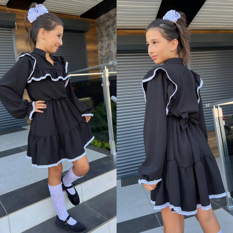 🆕🆕🆕🆕🆕🆕 платье с кружевом в черном цвете🥰 ‼️ткань долговечная, практичная (кр-жатка) талия и рукав на резинках, пояс ткань. мод 985 размеры: 134-140 146-152 158-164 🌹красивый, качественный отшил!, 🫶рекомендую!