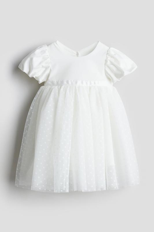 Платье из тюля с рукавами-буфами H&M на 3-4 года на р.104. Платье с короткими рукавами из мягкого матового атласа с юбкой из тюля в горошек. Круглый вырез горловины, застежка на пуговицы сзади и рукава-буфы с отворотами на потайной резинке. Отрезное по талии, декоративный атласный пояс и объемная юбка из нескольких слоев тюля. На подкладке. Состав. Верхний слой: Хлопок 96%, эластан 4%. Подкладка: Хлопок 100% Сетка: Полиэстер 100%. длина - 71 см, полуобхват подмышками - 32 см.