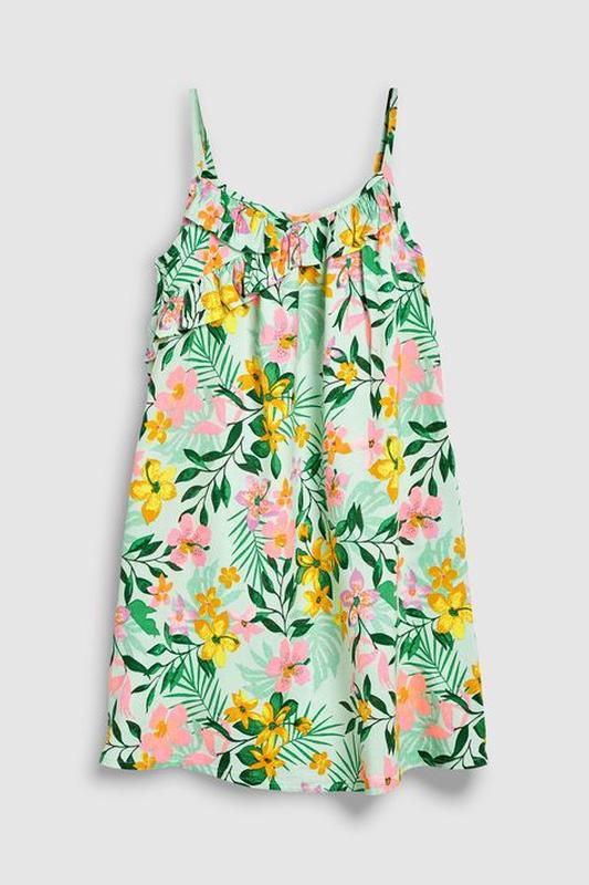 Next Girls Green Printed A-Line Dress Красивое летнее платье/сарафан от бренда Next для девочки 8 лет, рост 128 см. Изготовлена из легкой дышащей хлопковой ткани с тропическим цветочным принтом. Модель А-силуэта, на узких бретельках. Верхняя часть платья украшена воланом спереди, спинка на эластичной резинке. Замеры: Полуобъем груди 35 см (ще тянется до 42-43 см) Полуобъем бедер около 56 см Длина от плеча до низа 67 см Состав: 100% хлопок. Стан новой вещи, бумажной бирки нет (сток).