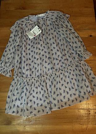 Повітряний, легкий шифон з дрібним рослинним принтом (листочки / гілочки). Блузоний верх: рукава з воланами Талія не сильно приталена, знизу спідничка розширена, з воланом — створює ефект ніжного, хлопковий підклад