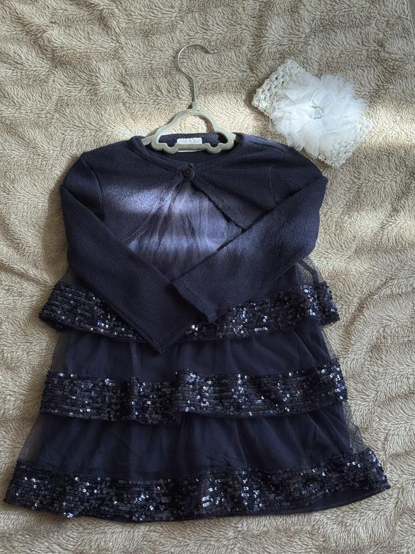 Темно-синя сукня з паєтками для дівчинки, легка кофтинка на біла повʼязка в подарунок 🎁 На 18-24 місяці Заміри: Довжина 44 Рукав кофтинки 32