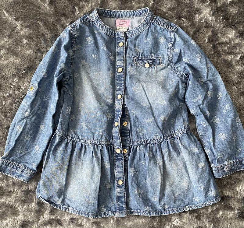 👗 Джинсова туніка/сорочка для дівчинки F&F • Розмір: 92-98(2-3роки) • Стан: гарний, без плям і пошкоджень • Колір: блакитний джинс з ніжним квітковим принтом • Застібається на кнопки, має маленьку нагрудну кишеньку • Знизу розкльошена — виглядає як сукенка • Підходить для садочку, прогулянок і свят