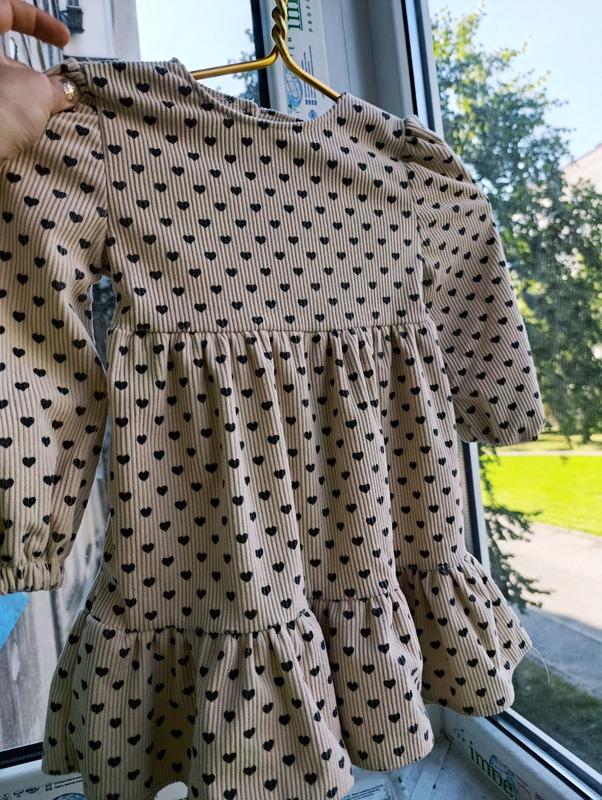 Отличное теплое платье из вельвета для девочки 3-4 лет. Имеет позади поясок, принт на платье в виде сердечек. Рукав имеет мягкую резиновую вставку. Сукня прикрашена невеликими оборками по низу виробу.