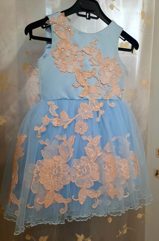 Розмір на дівчинку 3-4 роки. Ззаду регулюється шнурівкою, тобто можна брати на виріст. Довжина 64 см, ширина в талії 32,5 см. Спідниця має 5 шарів. Небесного кольору.