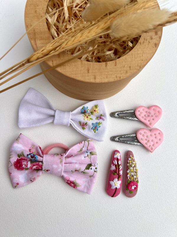 Наличие уточняйте.🌸Вышитый набор: бантики: белый на заколочке (ручная вышивка) 8*5 см, розовый на резиночке 8*6 см. Заколочки 5 см. 60 грн/шт. Продажа всего лишь набором, не разделяю: 370 грн. за набор. Качественные материалы, вышитые лучшими нитями DMC Франция. Всегда хорошая упаковка. Станут отличным аксессуаром или подарком.Цена окончательная. Также можно комбинировать с другими, запрашивайте, соберете красивый подарочный набор. 💖 Есть также вышитые бантики, резиночки, обручи. Оплата на картку. Всегда хорошая упаковка.