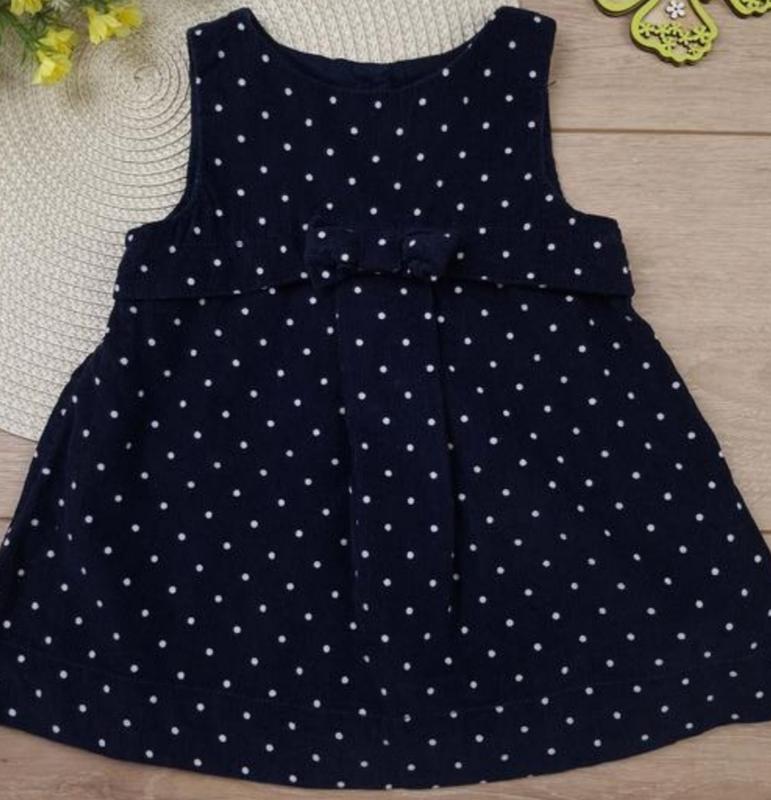 Платье без дефектов, в идеальном состоянии.Колир темно синий.Длина 37 см, Полуобхват груди 25 см.Принт горох.Материал вельвет.Фирма Baby Gap.