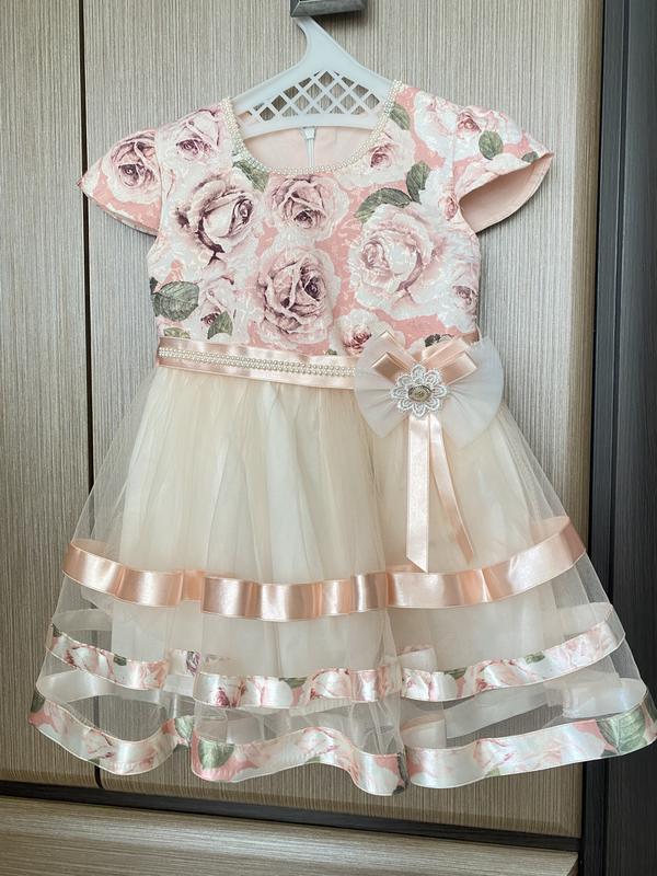 Сукня на дівчинку, виробництво Туреччина. Знизу Х/б підкладка. Дуже ніжне. Пояс знімається, бант-брошка також знімається. Є недолік ( намагалися виправити) на фото показала, загалом при носінні не видно. Дивиться інші оголошення, розвантажую шафу. Якщо є питання пишіть, можна на вайбер ( там відповідаю швидше)