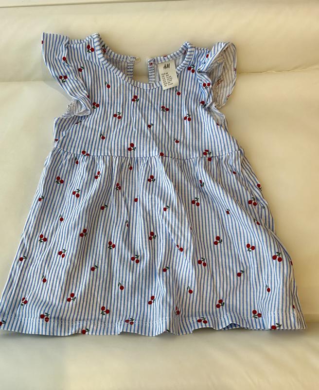 Сукня в смужку з вишнями H&M (р. 68) Сукня H&M у блакитно-білу смужку з принтом маленьких вишеньок. Легка та зручна модель для повсякденного носіння чи прогулянок. Рукавчики з воланами, застібка ззаду. Розмір: 68. Стан відмінний.