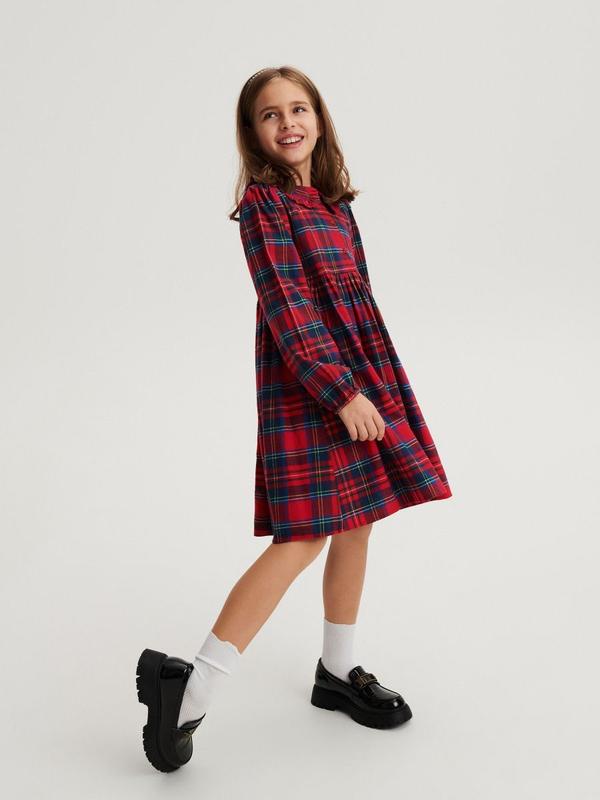 Красивое платье с воротничком, в клетку, хлопок, материал как фланель, теплое, на руковах резинка. Состояние нового, 1-2 раза одето. Размер 116, будет и дольше.