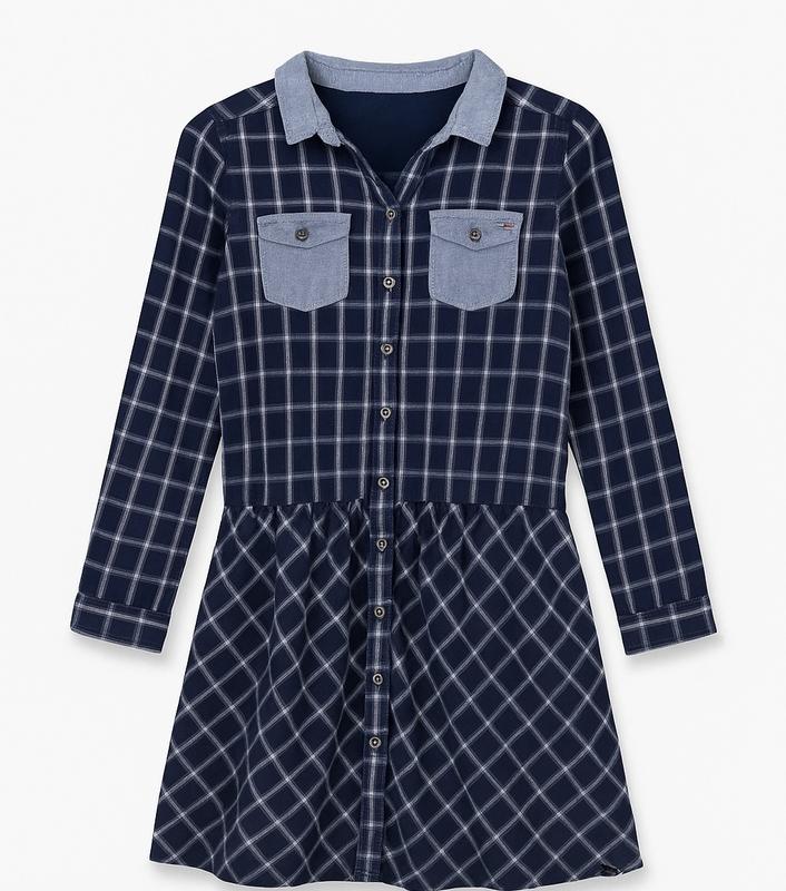 Стильна сукня-сорочка у синю клітинку від бренду Tommy Hilfiger. Модель виконана з м’якої, приємної до тіла бавовняної тканини. Має комір у джинсовому стилі, дві нагрудні кишені та застібку на ґудзики по всій довжині. Злегка приталений крій і спідниця з легким об’ємом створюють гарний силует. Стан: гарний, є невеликий дефект — пірване місце (можна легко підшити) Розмір: 152 см ( 11–12 років) Довжина: 78 см (до коліна)