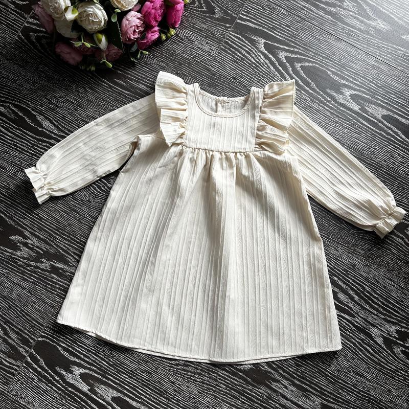 Вік: 3-4 роки Колір: беж Довжина: 55 см Плечі: 24 см Під руками: 34 см Рукав від шва: 34 см Тоненька тканина, плаття легесеньке, зручне. Ідеальний стан, на рукавчику залишилися маленькі цяточки від фломастеру, на практиці не помітно, в ціні враховано.