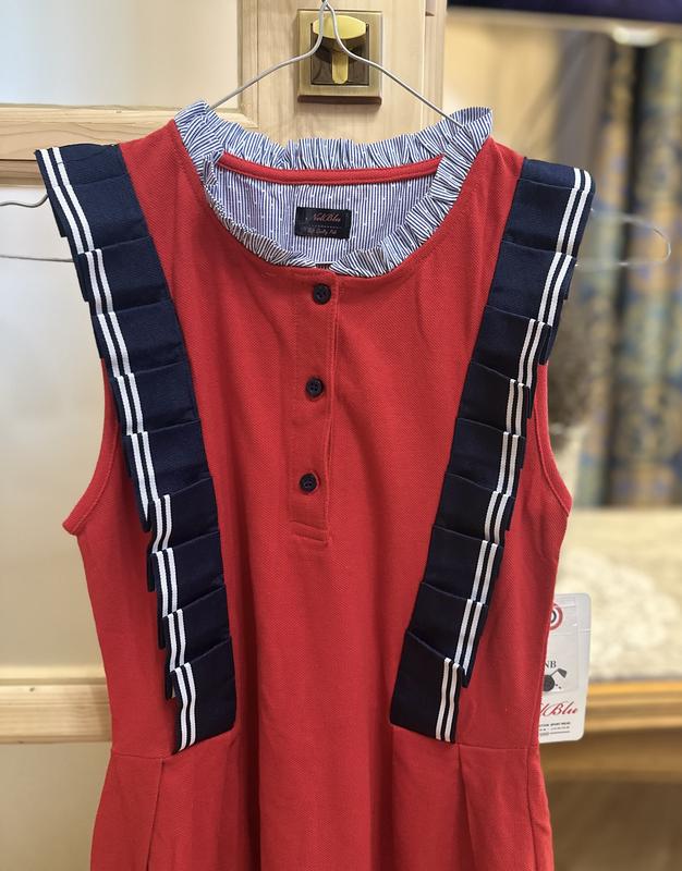 Яскраве, стильне та комфортне плаття для справжньої модниці. Модель без рукавів, із м’якого трикотажу. Вишукані темно-сині рюші зі смугастою стрічкою спереду додають контрасту та елегантності. Комірець — смугастий, у морському стилі, ніжно оздоблений хвилястим краєм. Спереду — застібка на гудзики, зручна та практична. Силует А-подібний, ззаду — складки, які гарно тримають форму! 📏 Довжина: ~86 см 📏 Ширина під руками: ~40 см 📐 Розмір: 14 (приблизно на 10–12 років) 💶 Ціна на бірці: 11,2 €
