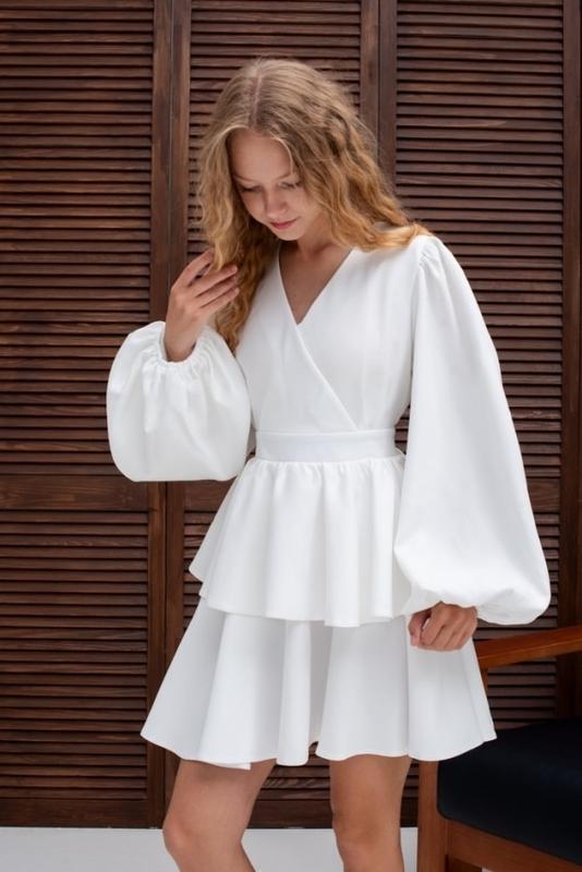 Сукня на запах Пояс пришит к платью, завязывается сзади. Тканина - костюмна. Цвет - молочный. Замеры: 140 длина - 68см, полуобхват груди - 37см, рукав от плеча - 55см. 146 длина - 72см, полуобхват груди - 39см, рукав от плеча - 57см. 152 длина - 77см, полуобхват груди - 43см, рукав от плеча - 60см. 158 длина - 80см, полуобхват груди - 44см, рукав от плеча - 64см. Размеры в наличии: 140-4шт 146-2шт 152-1шт 158-2шт