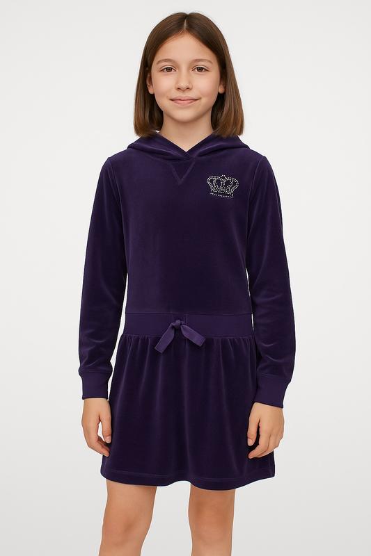 Зручна та стильна сукня з м’якого велюрового трикотажу, глибокого фіолетового кольору. Модель має довгі рукави, капюшон, пояс зі стрічкою на талії та акуратну аплікацію-корону зі стразів. Дуже приємна до тіла — 80% бавовна, 20% поліестер. 📌 Ідеальний варіант для: • Прогулянок • Школи • Домашнього затишного носіння (завдяки м’якому та теплому матеріалу) 📏 Заміри • Зріст (за біркою): 146–152 см • Довжина по спинці: ~76 см • Ширина плечей: ~32 см • Грудна клітка: ~39 см • Рукав від плеча: ~56 см • Талія (стрічка): ~34–38 см