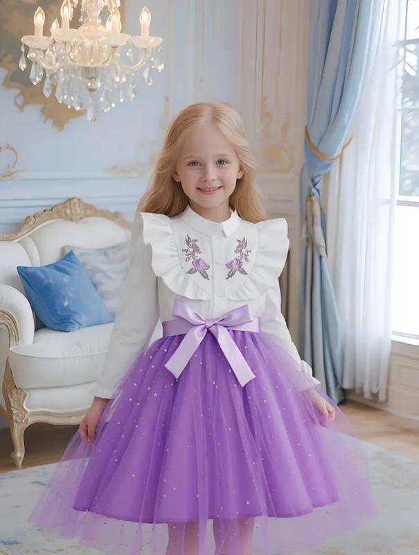 2025 Новое платье для девочек с длинными рукавами, вышивкой цветов и шармами, фиолетово-белое контрастное, со стразами в виде звездочек и поясом – элегантный осенне-зимний наряд размер 7 р Грудь 68, длиж 73, талия 63. Рукав 43. Плечи 27.3