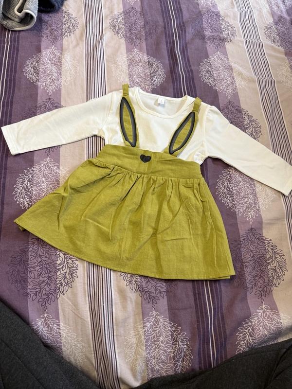 Сукня-сарафан в стилістиці зайка. Ідеальна на теплу весну-літо. Тканина - легка, дихаюча. Футболка вшита в спідницю Довжина: 42см Ширина - 25 см Рукав - 25.5 Купували на вік 2 роки, не носилося