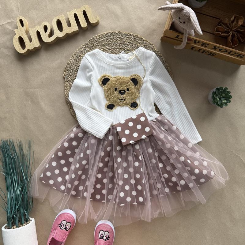 Нежное и стильное платье с сумочкой в комплекте! Верх – ткань трикотаж рубчик, юбка – фатин с трикотажным подкладом. Спереди украшена объемной нашивкой. Сзади – застегивается на потайную молнию и пояс. Размеры: 98 – рукав 33, длина 53 104 – 35 / 55 110 – 37 / 58 116 – 39 / 61 122 – 42 / 63