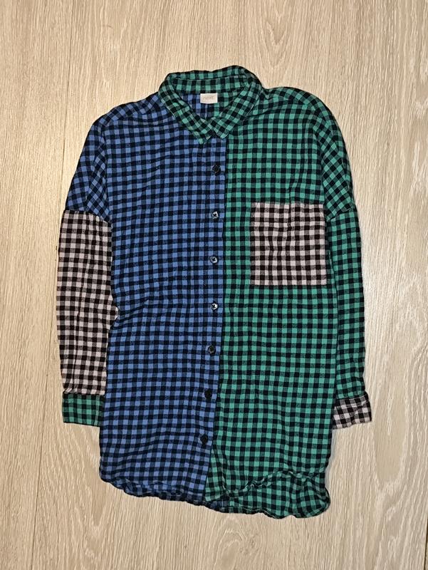 Фирменное, теплое клетчатое удлиненное разноцветное платье свободного кроя на 8 лет выглядит очень стильно! Сочетание синего, зеленого и розового цветов изысканно, делая ее центральным элементом любого наряда. Застегивается на пуговицы Ткань 100% хлопок. Состояние отлично Замеры: длина по спинке 65,5 см, ширина между подмышками 50,5 см, плечи приспущены 61,5 см, рукав от воротника 57,5 см, по внутреннему шву 28 см