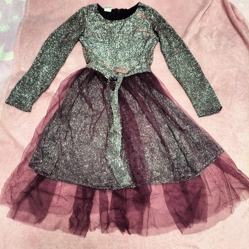 Продам праздничное платье, цвет темно-бордовый, полностью в блестках, переливается. Состоит из платья и накидки из фатина на пояс. На рост 152 см.