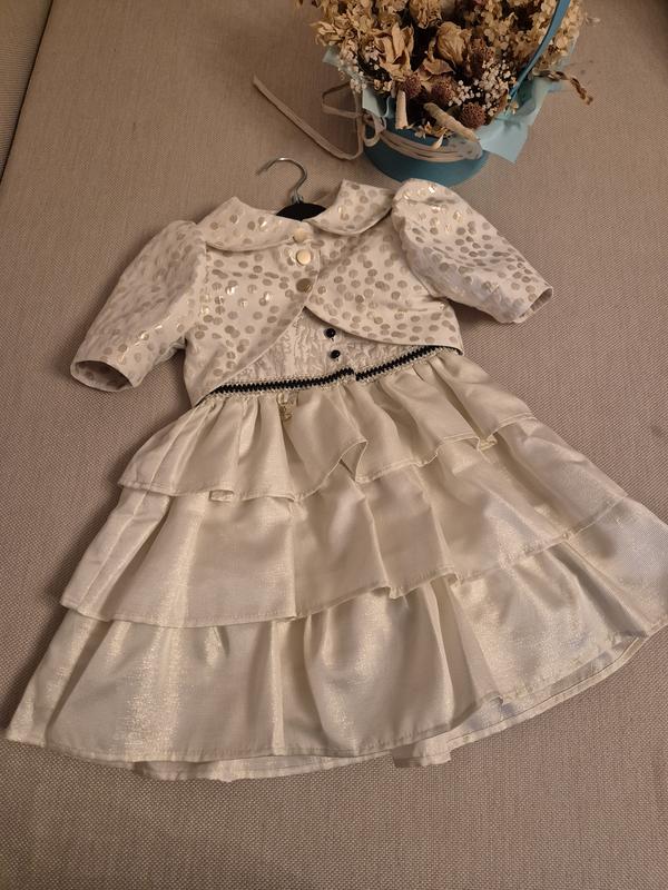 Комплект идеально подойдет на праздники, особые события или фотосессию! Совершенно новая вещь, но у бирок нет На девочку 2-3 года, на рост 98см Замеры платья: Длина изделия по спине - 50см Полуобхват груди – 27см Замеры балеро (пиджачка): Длина изделия по спине - 22см Полуобхват груди – 28см Длина рукава - 19см Дополнительные замеры и фото вышлю по запросу. Доставка за счет покупателя в любую точку Украины укрпоштой, новой почтой или meest. Возможен накладной платеж по предварительной подписке 200грн или оформляйте безопасную оплату