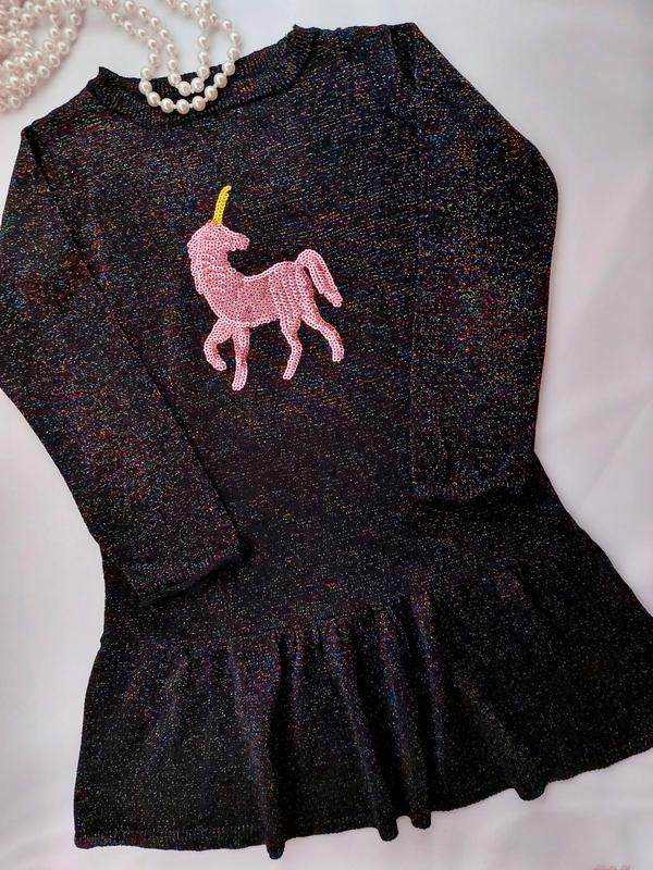 Очаровательное нарядное платье с блестящей люрексовой нитью. Единорог - из блестящих пришивных пайеток. Красиво переливается. На возраст 5-6лет. рост 116. замеры смотрите на фото. Одето 2 раза. В идеале. Только сзади внизу на подоле поднимала петельку. С лицевой ничего не видно.