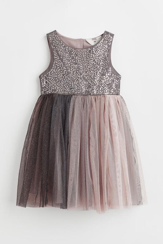 H&M дитяча сукня 7-8 років (128см) Дитяча сукня з колекції H&M, яка складається з блискучого верху, оздобленого паєтками, та багатошарової спідниці з тюлю. Деталі про сукню: Верхня частина: без рукавів, з круглим вирізом, прикрашена сріблястими паєтками. Спідниця: розкльошена, багатошарова, складається з тюлю різних відтінків (сірого, бежевого та білого). .