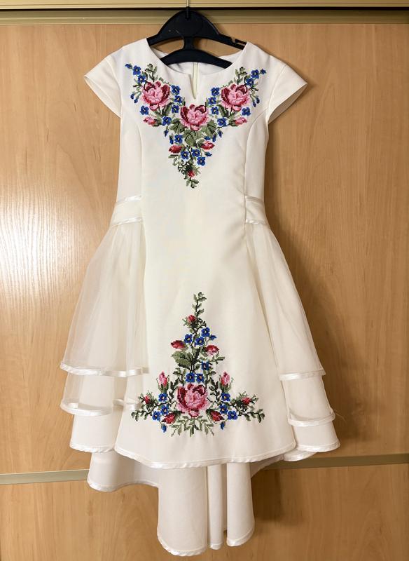 В хорошому стані вишита сукня молочного кольору. Розмір 116/122. Без пошкоджень. Застібається на блискавку на спинці, також є пришитий пояс. Довжина спереду 64 см, по спинці 75 см, напівобхват таліі 29 см.