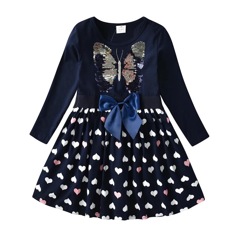 Детское трикотажное платье для девочки. По переду платье украшено переливающимися пайетками. По талии пояс-резинка + декоративный бант. Платье без утепления. Vikita. р.110 / 4-5 лет: рукав от плеча 37, плечи 24, длина 58, ширина груди 29