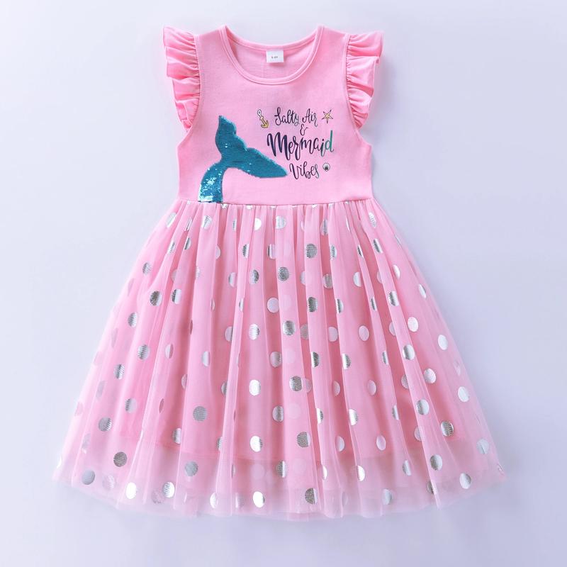 Детское трикотажное платье платье для девочки. Платье с короткими рукавами и пайетками, выполненное из хлопка и фатина. Она имеет многослойную юбку, украшенную горошками. р.116 / 5-6 лет: длина 63, плечи 24, ширина груди (ПОГ) 34 Наш магазин: ***********************