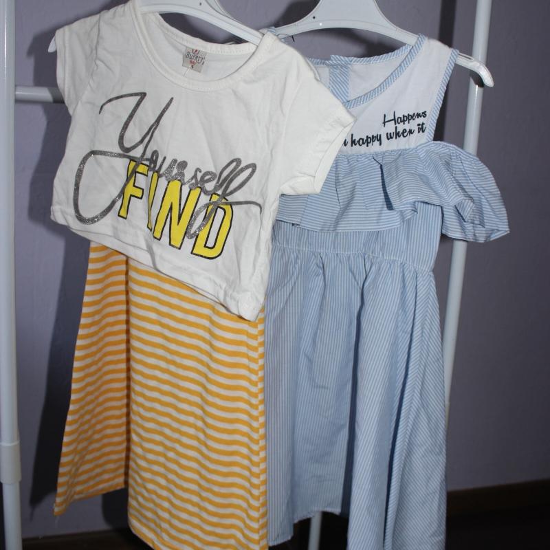Платье голубое в белую полоску Платье на 6 лет длина изделия 60 см плечи 28 талия 28 на резинке тянется до 32 рукава надеваются на плечи тоже на резинках очень красивая модель сзади на пуговицах