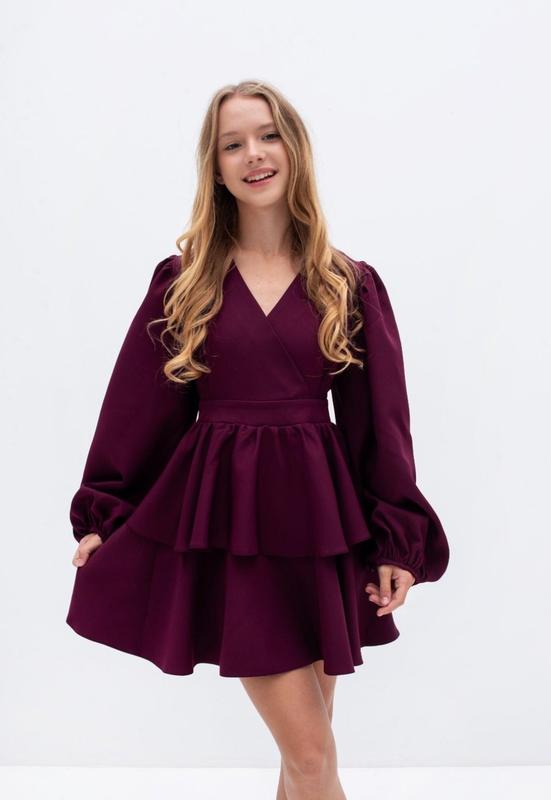 через кнопку купити тільки повна оплата!!! Сукня на запах Пояс пришитий до сукні, зав'язується позаду. Тканина - костюмна. Колір - бургунді. Заміри: 140 довжина - 68см, напівобхват грудей - 37см, рукав від плеча - 55см. 152 довжина - 77см, напівобхват грудей - 43см, рукав від плеча - 60см. Мс