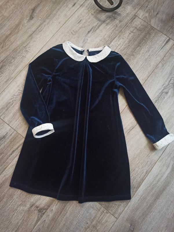 нереально крута оксамитова сукня в стилі Венздей. колір глибокий темно-синій. на комірці і манжетах золотисті вкраплення. Виглядає дуже ошатної і при цьому приємна до тіла і зручна для дитини. Ваша красуня буде в захваті!!! Стан - як нова. на 3-5 років