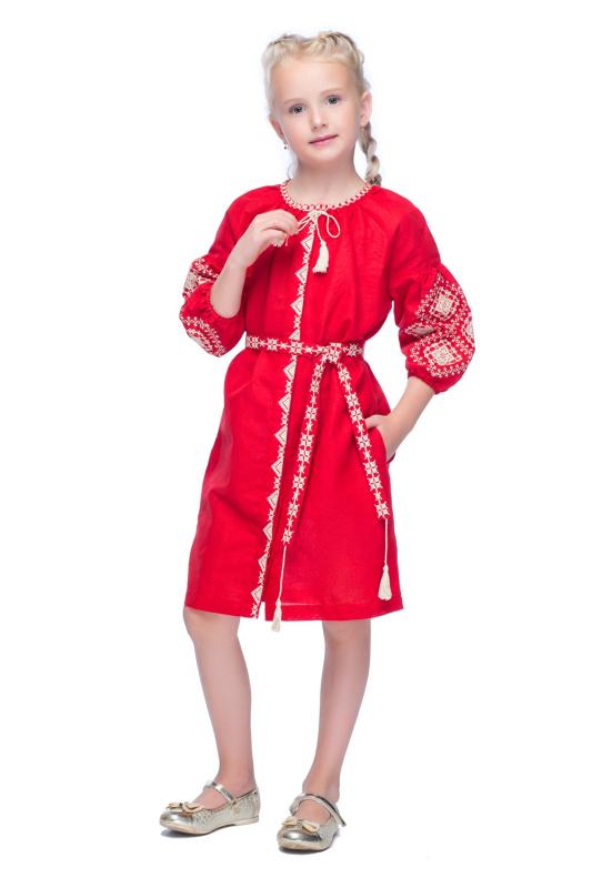 Стильное вышитое красное платье это незаменимая вещь в гардеробе каждой маленькой украиночки. Платье имеет прямой свободный силуэт. Подчеркнуть талию поможет пояс с вышивкой, который прилагается к платью. Пояс и горловина украшены витыми шнурами с кисточками. Длинный рукав реглан, длина платья до колена и скрытые застежки-пуговицы - делают вещь практичной. Вышивка выполнена гладью и размещена на рукавах, горловине, вдоль застежек и по низу платья. Орнамент в виде загадочного, многоликого могучего дерева-цветки - символизирует материнскую силу Женщины. Образ Берегини - важный символ, встречающийся во многих орнаментальных композициях. Берегиня символизирует Дерево Жизнь, которое представляет собой сочетание трех миров и символом гармонии Вселенной