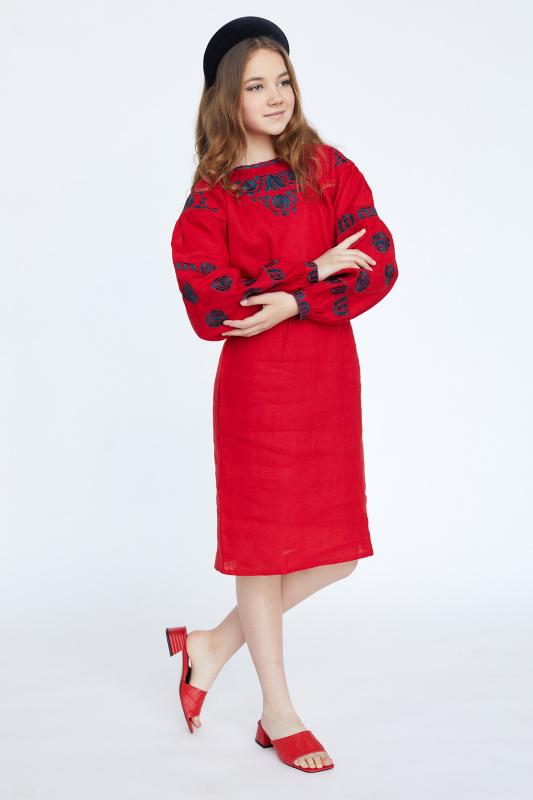 Стильное вышитое красное 002 платье это незаменимая вещь в гардеробе каждой маленькой украиночки. Платье имеет прямой свободный силуэт. Подчеркнуть талию поможет пояс с вышивкой, который прилагается к платью. Пояс и горловина украшены витыми шнурами с кисточками. Длинный рукав реглан, длина платья до колена и скрытые застежки-пуговицы - делают вещь практичной. Вышивка выполнена гладью и размещена на рукавах, горловине, вдоль застежек и по низу платья. Орнамент в виде загадочного, многоликого могучего дерева-цветки - символизирует материнскую силу Женщины. Образ Берегини - важный символ, встречающийся во многих орнаментальных композициях. Берегиня символизирует Дерево Жизнь, которое представляет собой сочетание трех миров и символом гармонии Вселенной