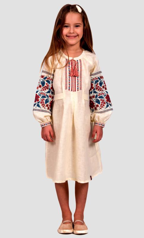 Нарядное платье вышиванка для девочки из натурального льна сливочного цвета станет украшением гардероба и любимой одеждой в те дни, когда душа желает праздника. На рукавах и на груди платья искусно украшена вышивкой, выполненной красными и синими нитями. Архитектонику орнамента составляет растительный и геометрический орнамент, однако особо выразительно заметны на нем розы и поросечки, придающие особенности, необычности изделию. Чтобы разгадать символизм орнамента, стоит вспомнить значение его элементов. Роза символизирует любовь и солнце, смотрится очень нежно, женственно. Веточки красной смородины также подчеркивают красоту, указывают на плодородие земли и обещают щедрость, изобилие. Прямые геометрические линии, которые замкнуты в круг, являются знаком бесконечности. Платье вышиванка для девочки – ее особенности, преимущества Если вам нужно создать для девочки яркий, нарядный образ в национальном стиле, рекомендуем купить платье вышиванку для девочки именно этой модели. Она отлично подойдет к любому празднику, при этом будет уместной и в будни. Особенность регулируемого по талии поясом кроя позволяет сукке отлично садиться по фигуре девочки, не смотря на ее параметры. Кроме того, представленное вышитое платье для девочки имеет следующие особенности, преимущества: натуральный материал – 100% лен сливочного цвета, обладающая отличной воздухопроницаемостью, высокой гигроскопичностью, антибактериальными и гипоаллергенными свойствами, стойкостью к износу; платье отличается интересным орнаментом, стилизованным под национальные мотивы; практичный длинный рукав щедро украшен растительной и геометрической вышивкой, он имеет декорированный манжет на пуговице; округлая горловина удобно регулируется завязками-катасиками; комфортная длина ниже колена, практичное решение с поясом, регулирующим объем платья.