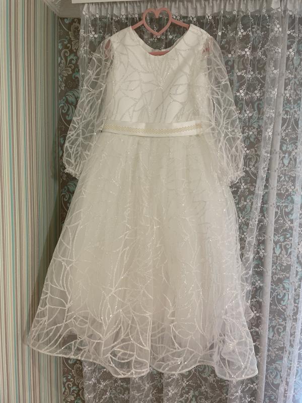 Красиве пишне плаття на дівчинку,дуже гарно виблискує на сонці,на довгий рукав з фатіну,Застібка на замку і додатково затягується шнурівками по фігурі. Є круги.Колір білий,на святкування будь-якої події .Дівчинка буде як принцеса Одягалось один раз на випускний у садочок!
