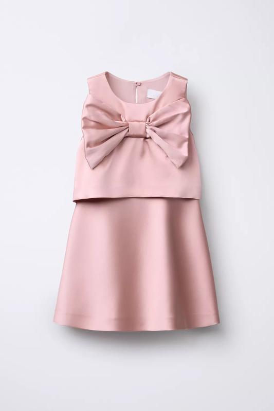 Атласна сукня з круглим коміром і без рукавів. Виріз у вигляді краплі з ґудзиком ззаду. Бант спереду. РОЖЕВИЙ | 6898/572/620