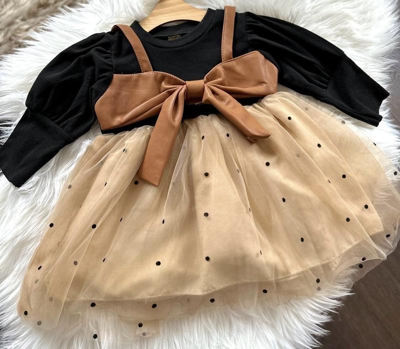 Верх - бавовна Пдкладка - хб Дуже красивий та великий бант з екошкіри Два шари фатину Рукава ліхтарики Виміри 80-Довжина 43 см Рукав від горла 28 см об'єм грудей 25*2 см 90-Довжина 45 см Рукав від горла 32 см об'єм грудей 27*2 см 100-Довжина 48 см Рукав від горла 34 см об'єм грудей 28*2 см 110-Довжина 51 см Рукав від горла 35 см об'єм грудей 29*2 см