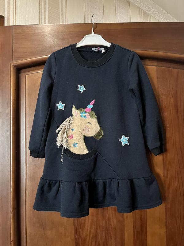 Тепленька трикотажна без флісу сукня для дівчинки на 4-5 років , темно синього кольору з кишенькою спереду